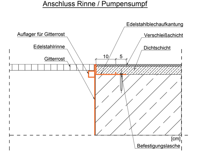 Sind Edelstahlbauteile wie Rinnen, Pumpensümpfe oder Randaufkantungen in das QZ-Stahlfaser-Dichtschichtsystem zu integrieren, müssen diese vor der Herstellung der Dichtschicht eingebaut werden. Alle Schweißnähte der Edelstahlbauteile werden flüssigkeitsdicht ausgeführt und vollständig auf Dichtheit geprüft.