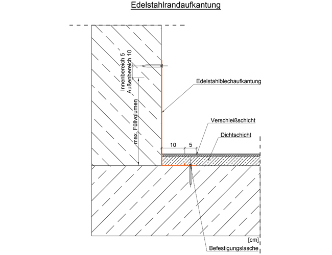 Zur Ausbildung einer Auffangwanne wird das QZ-Stahlfaser-Dichtschichtsystems dort, wo es an Wänden endet oder z. B. durch Stützen durchdrungen wird, um Randaufkantungen aus Edelstahl ergänzt. Die Randaufkantungen werden an den aufgehenden Bauteilen bis über den im Havariefall zu erwartenden Höchststand der Flüssigkeit geführt. Der Fuß der Edelstahlrandaufkantung wird so ausgeführt, dass die Stahlfaser-Dichtschicht flüssigkeitsdicht und wartungsfrei an die Randaufkantung anschließt.